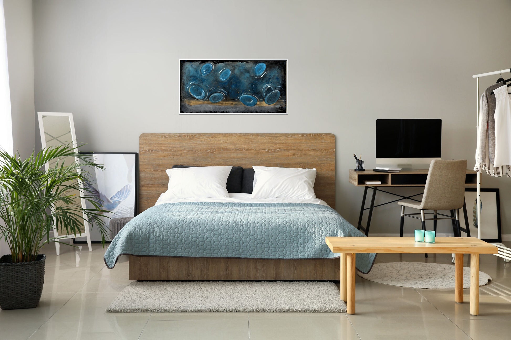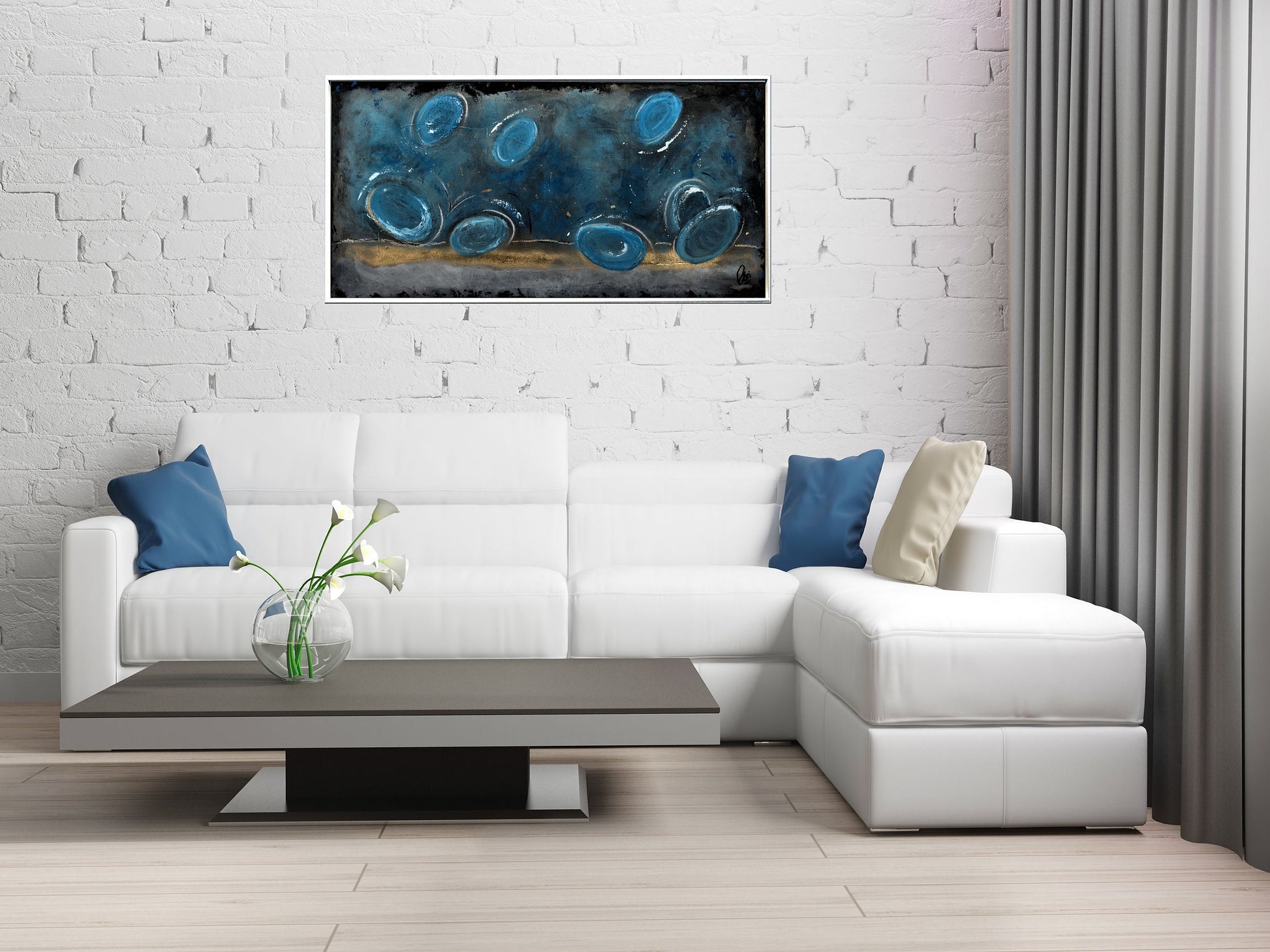 This original abstract acrylic painting by Edelgard Schroer combines deep shades of blue with shimmering gold accents on a richly textured surface. Subtle cracks and multiple paint layers create an elegant, slightly aged look, while the bold circular shapes add a playful yet sophisticated rhythm to the composition. A matte finish protects the surface and enhances the color depth.