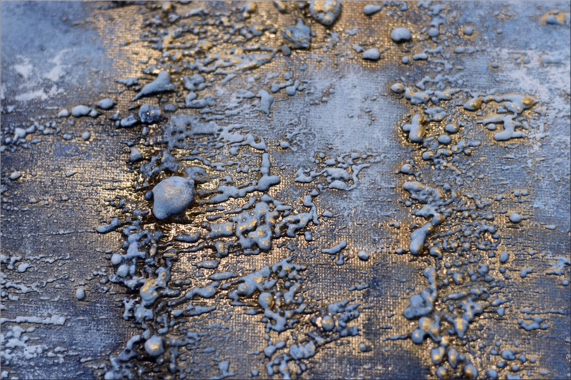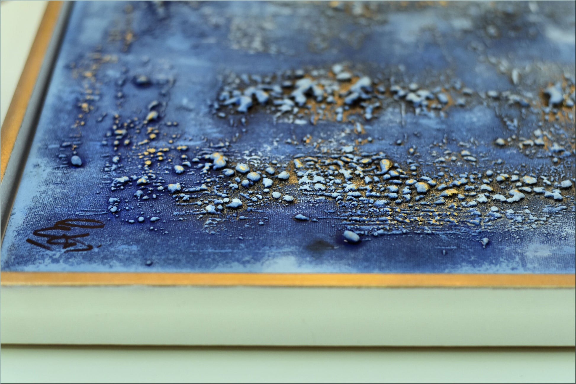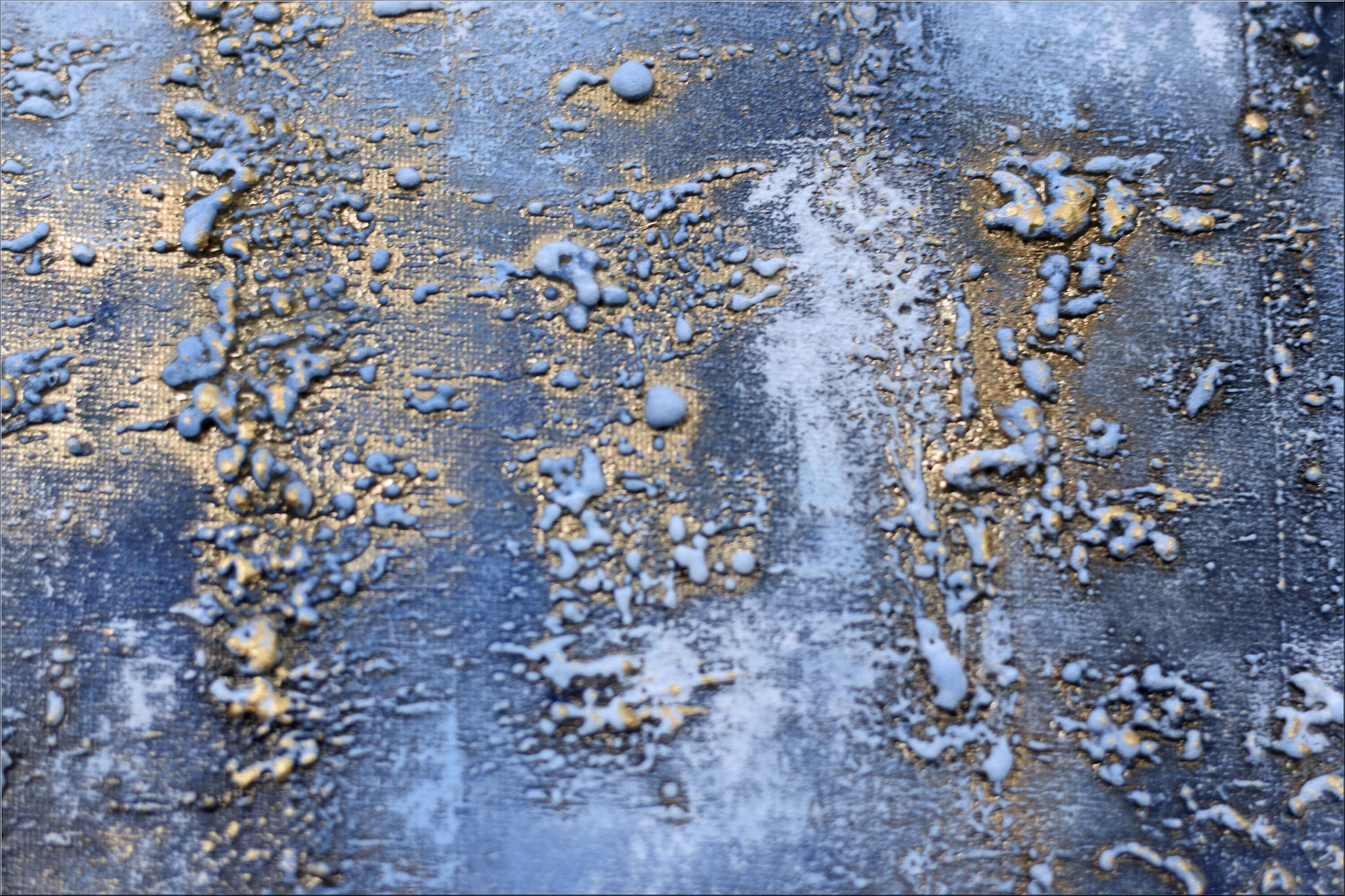 This original abstract acrylic triptych by Edelgard Schroer features a captivating interplay of deep blue, shimmering gold, and soft white tones. The structured surface creates striking depth and tactile texture, while the metallic accents add a luminous effect. Comprising three tall panels, this oversized artwork brings elegance and vibrancy to any modern living space.