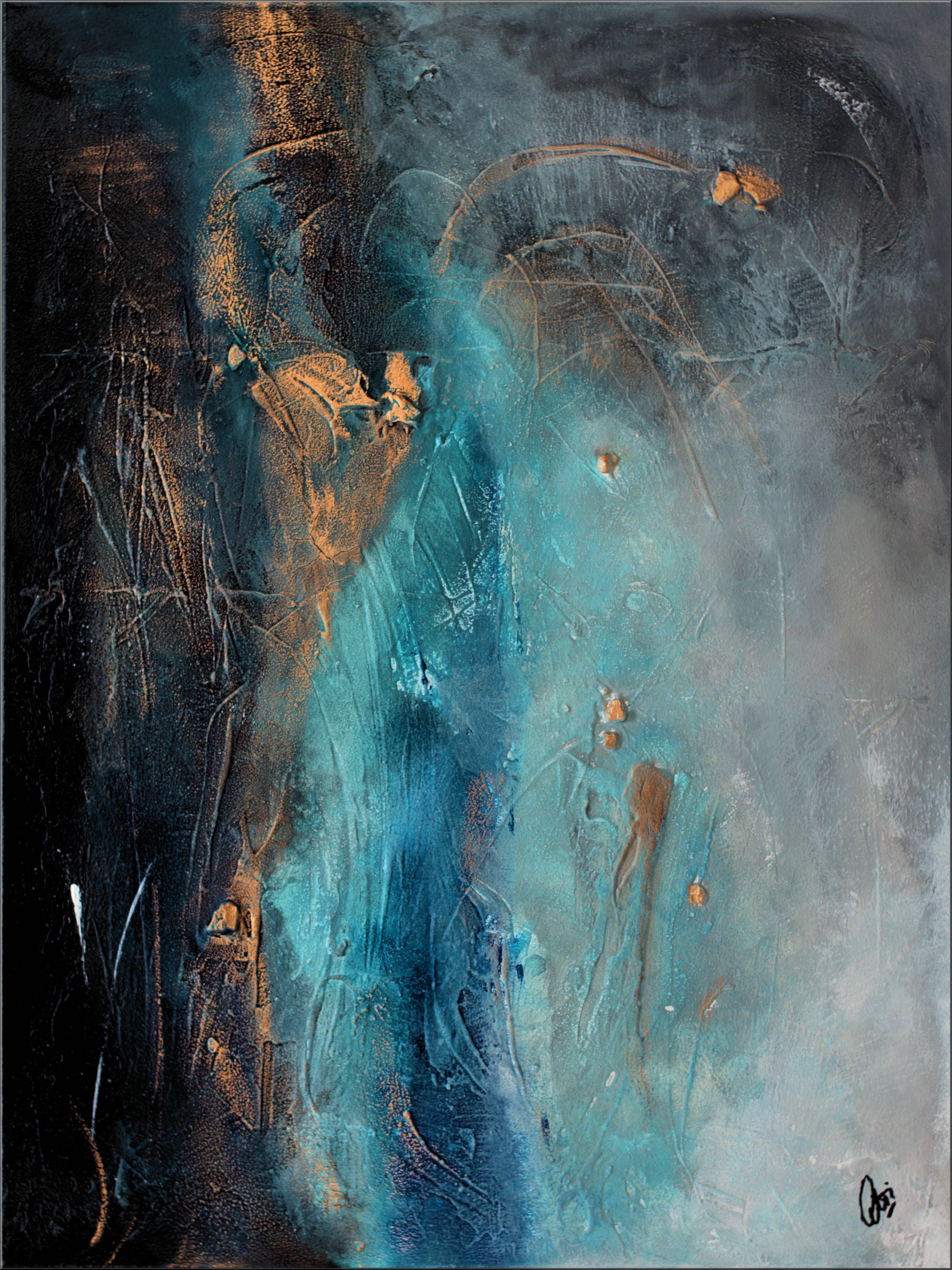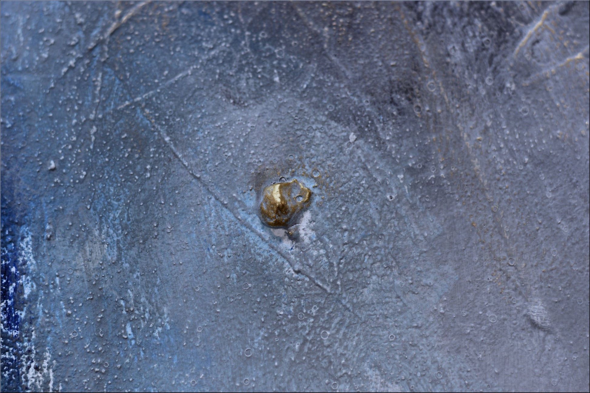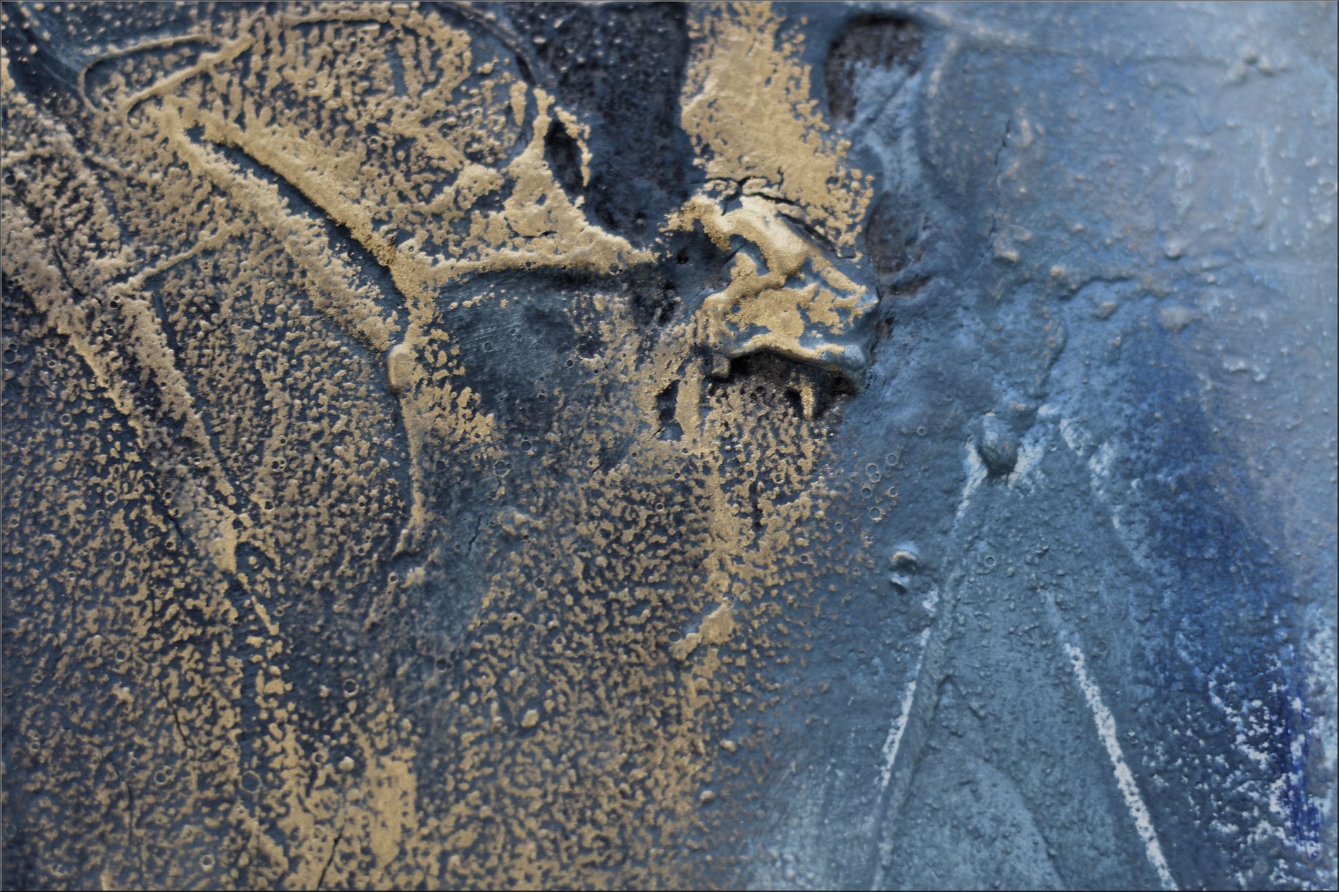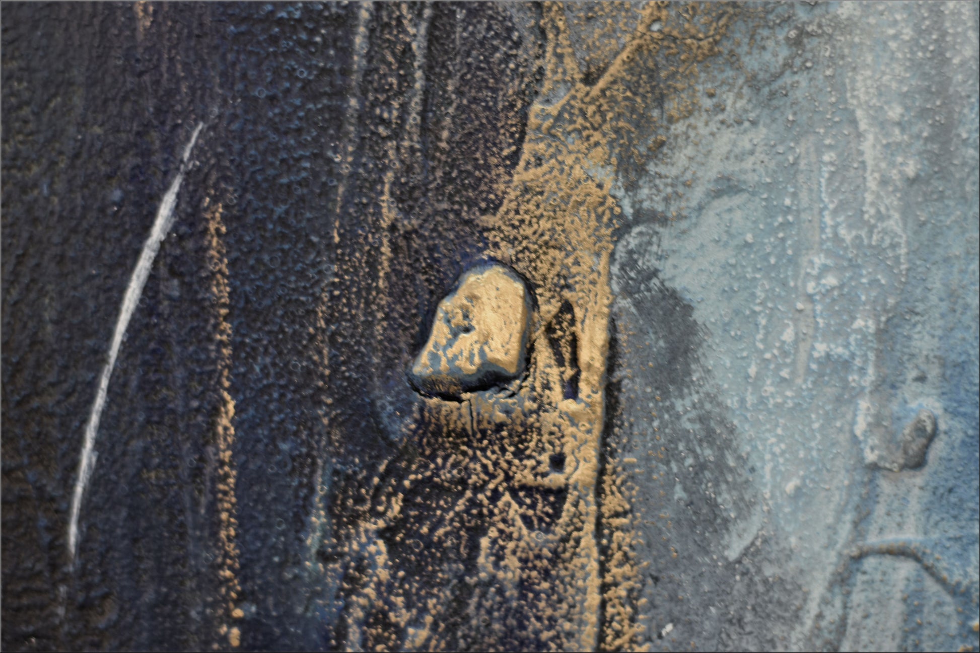 The color palette features blue, white, black, grey, and golden accents, brought together in a composition full of organic movement and mystery. Subtle cracks, surface textures, and expertly applied acrylic layers create a visually dynamic and aged aesthetic that rewards repeated viewing.
