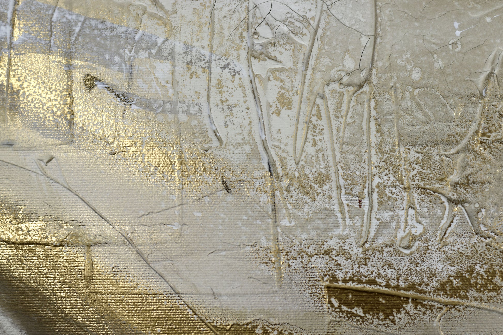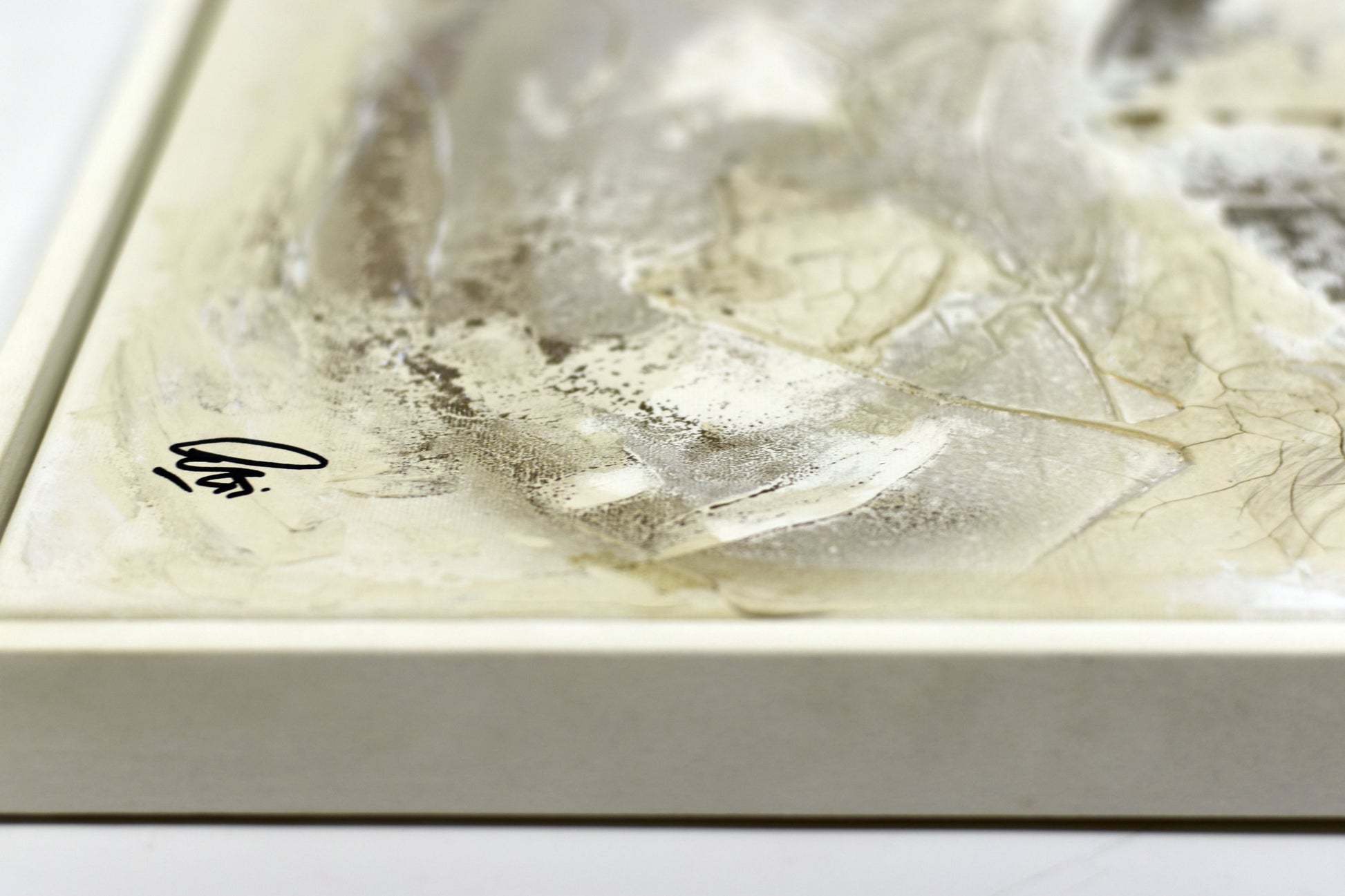 Golden highlights and coffee-toned hues dance across the layered surface, creating a shimmering landscape of abstract energy. Framed in a sleek white floating frame, this piece offers a modern, elegant presence — perfect for any refined interior.