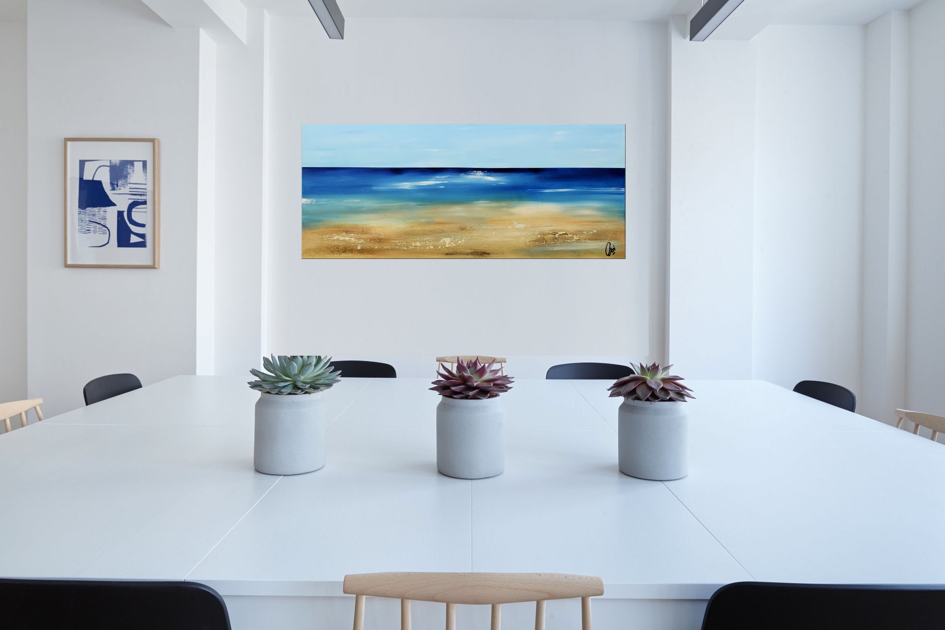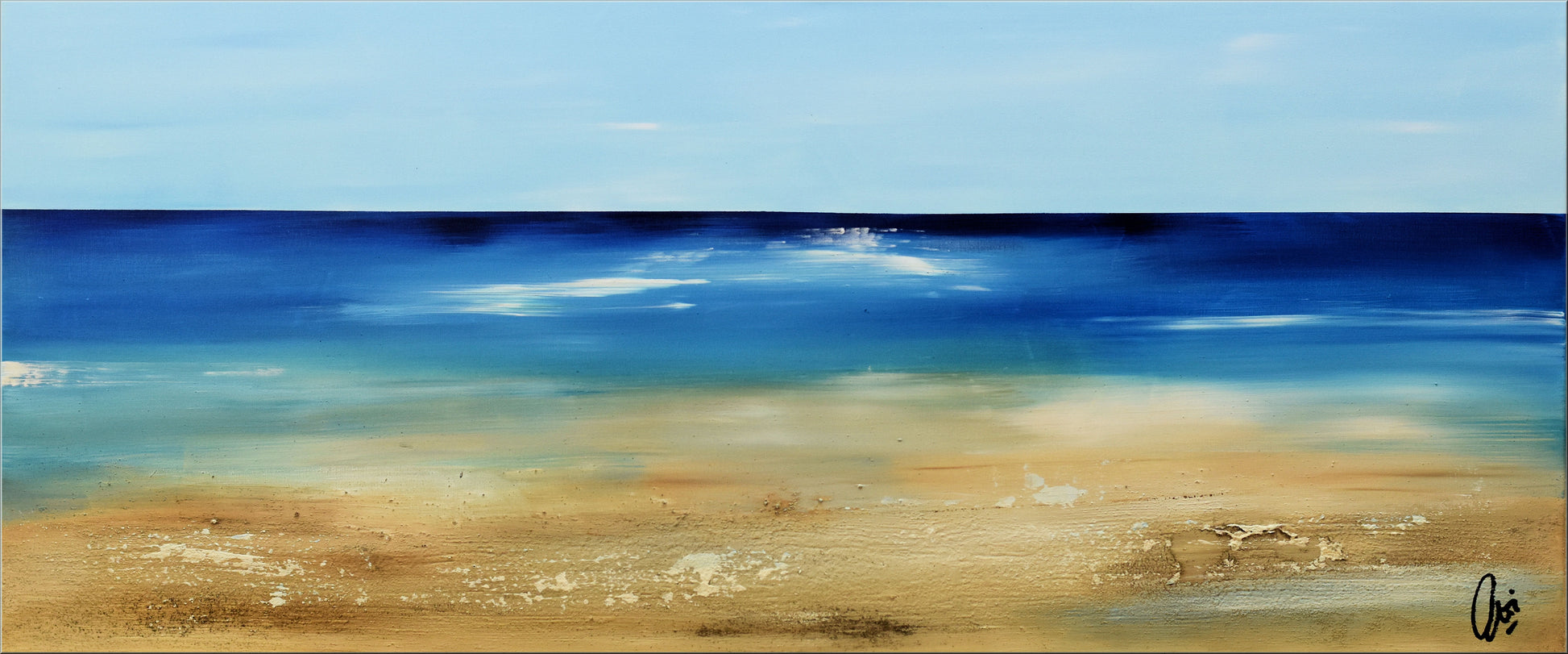 Dieses großformatige Acrylgemälde auf Leinwand ist ein modernes Wandkunstwerk, das durch seine kräftigen Blautöne, sanften Sandfarben und dezenten Texturen eine Atmosphäre von Weite und Gelassenheit schafft. Die Horizontlinie und das sanfte Zusammenspiel von Licht und Farbe lassen Erinnerungen an das Meer wach werden.