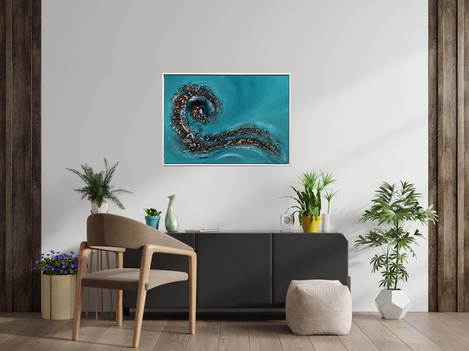 This original textured acrylic painting by Edelgard Schroer evokes the swirling motion of underwater currents and geological formations. A rich turquoise base, accented with bronze, white, and deep oceanic black, draws the viewer into a meditative exploration of natural force and fluidity.