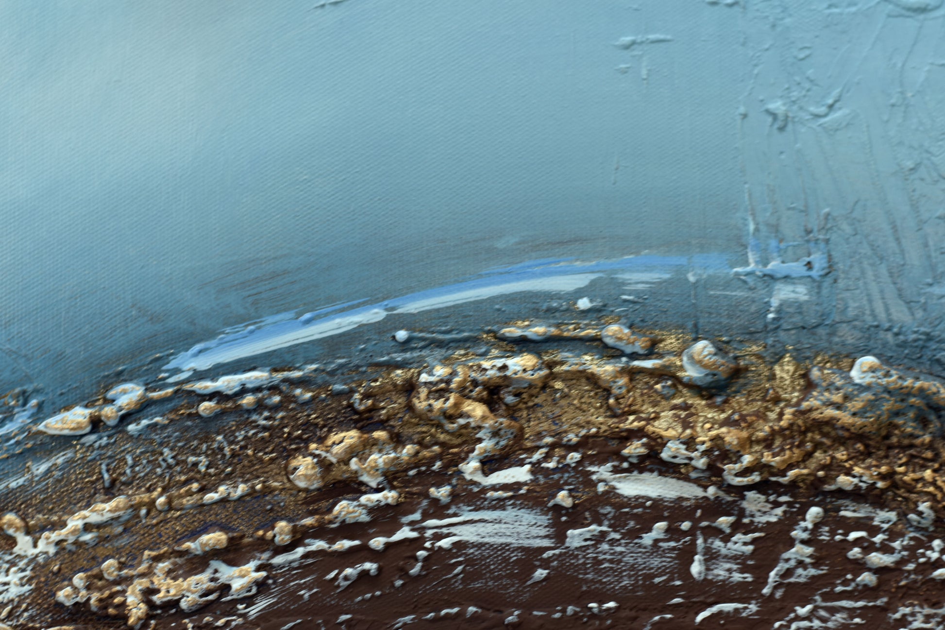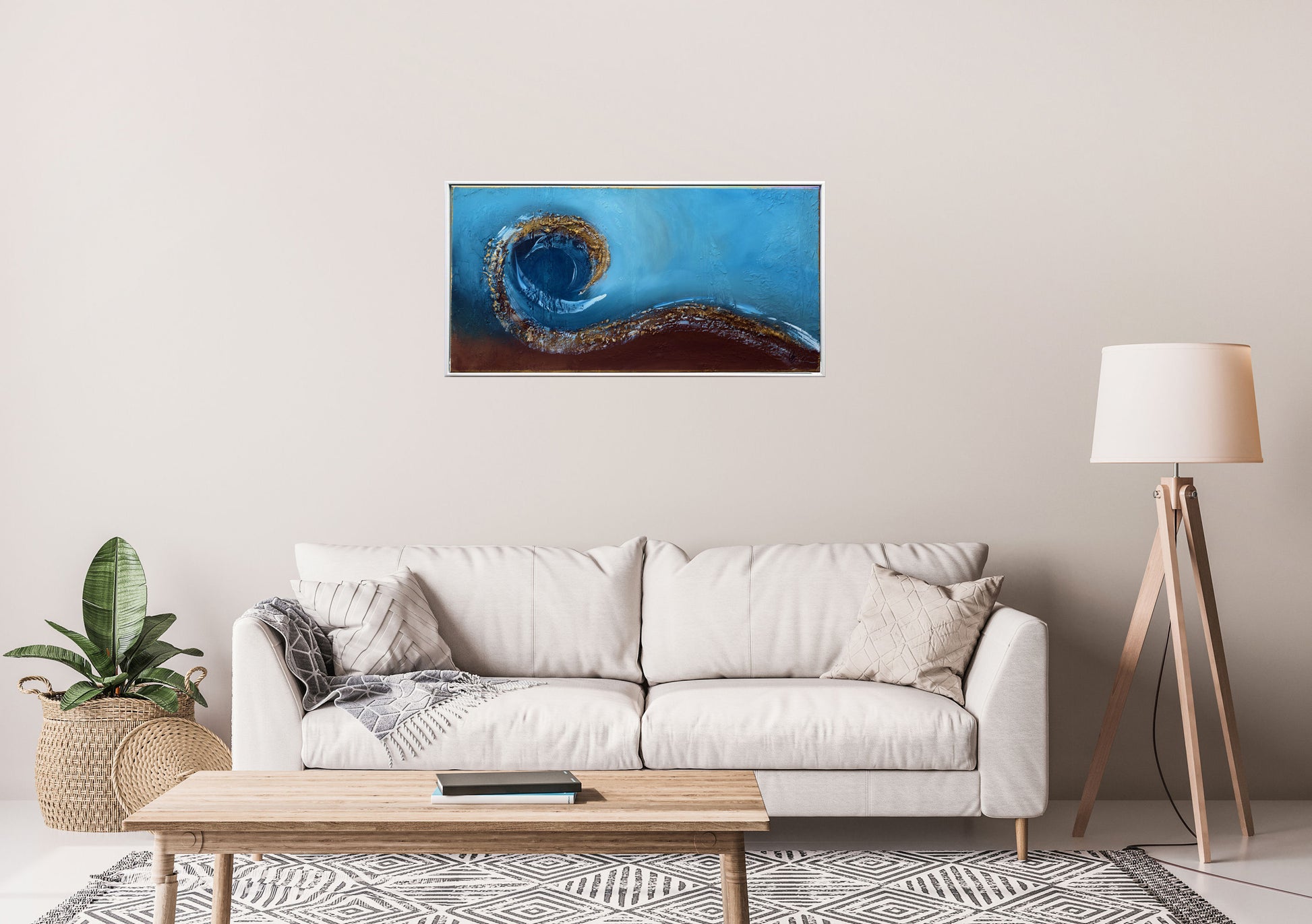 This original abstract spiral acrylic painting by Edelgard Schroer combines deep blue tones with shimmering golden highlights and earthy brown textures. The spiral composition symbolizes the flow of time and the eternal rhythm of nature, creating a powerful and harmonious visual presence.