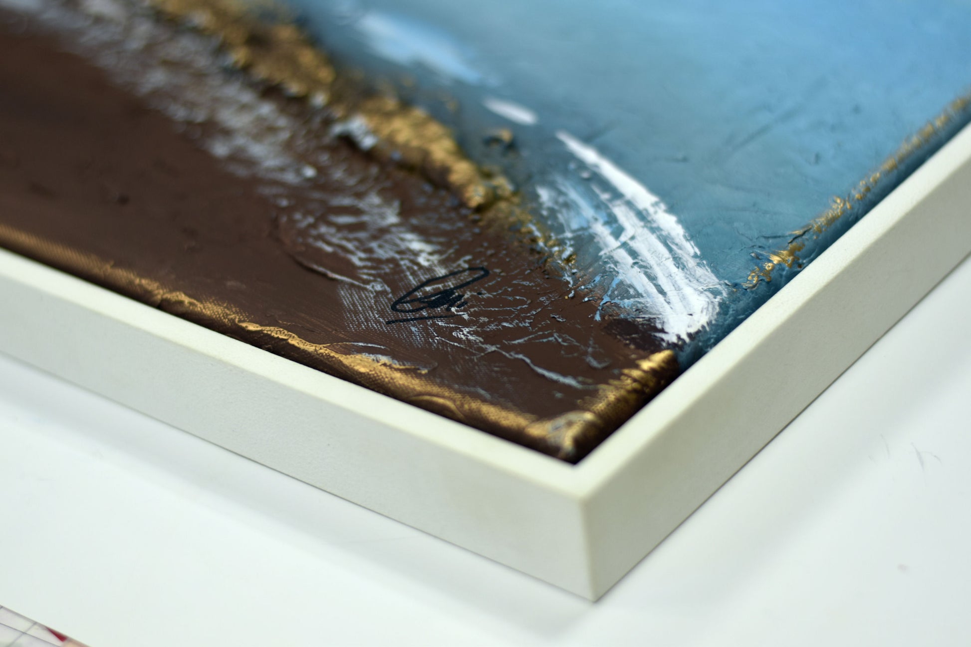 The richly textured surface with layered paint invites the viewer to follow its dynamic movement and luminous details. Painted on high-quality canvas, the artwork is framed in a white floater frame and arrives ready to hang. Signed on the front by the artist, this unique piece makes a striking centerpiece for contemporary interiors.