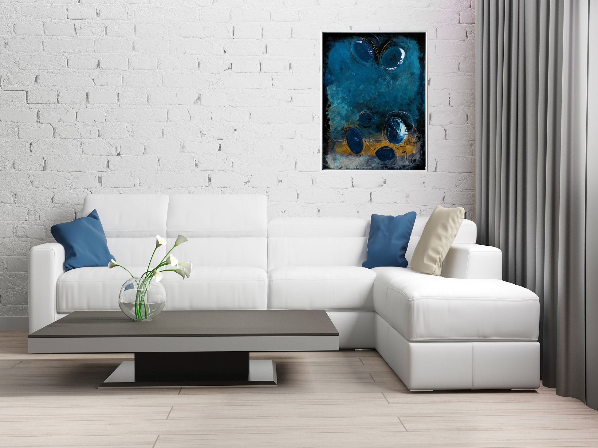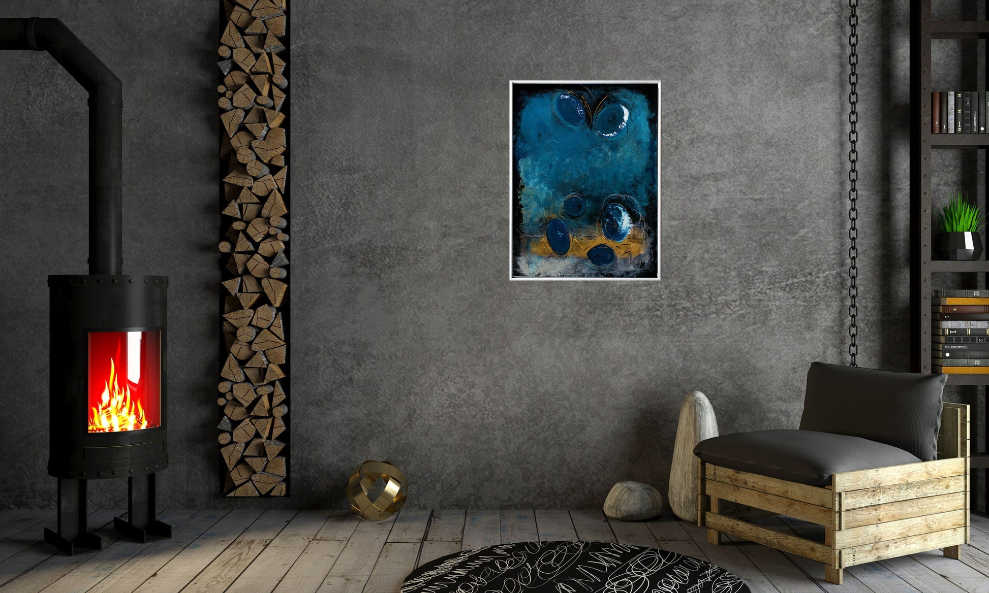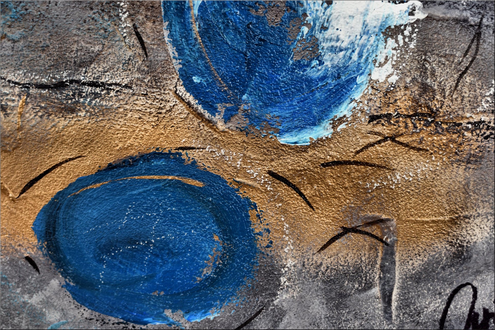 This original abstract painting by Edelgard Schroer combines deep shades of blue with shimmering gold accents on a richly textured surface. Subtle cracks and multiple layers of acrylic paint create an elegant, slightly aged look, while the free-floating circular shapes bring a sense of movement and lightness to the composition. A matte finish protects the surface and enhances the color depth.
