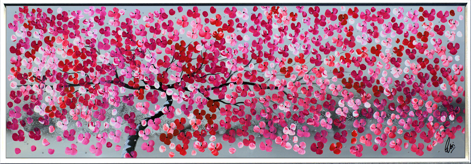 This original acrylic painting by Edelgard Schroer captures the joyful beauty of a blossoming cherry tree in full bloom. Countless blossoms in shades of magenta, red, pink, and white unfold on a subtle grey background with silver accents. The vibrant colors and textured brushstrokes bring movement and vitality, making this artwork an uplifting centerpiece for any modern interior.