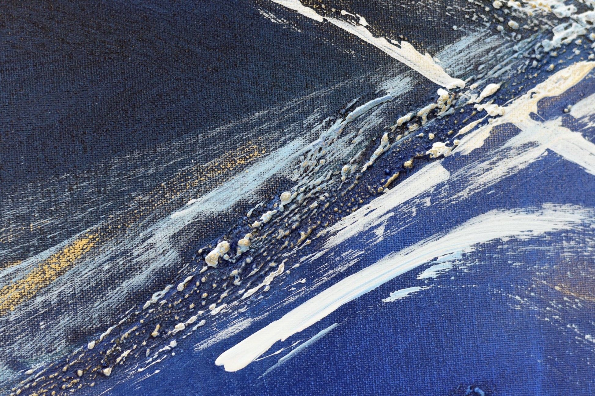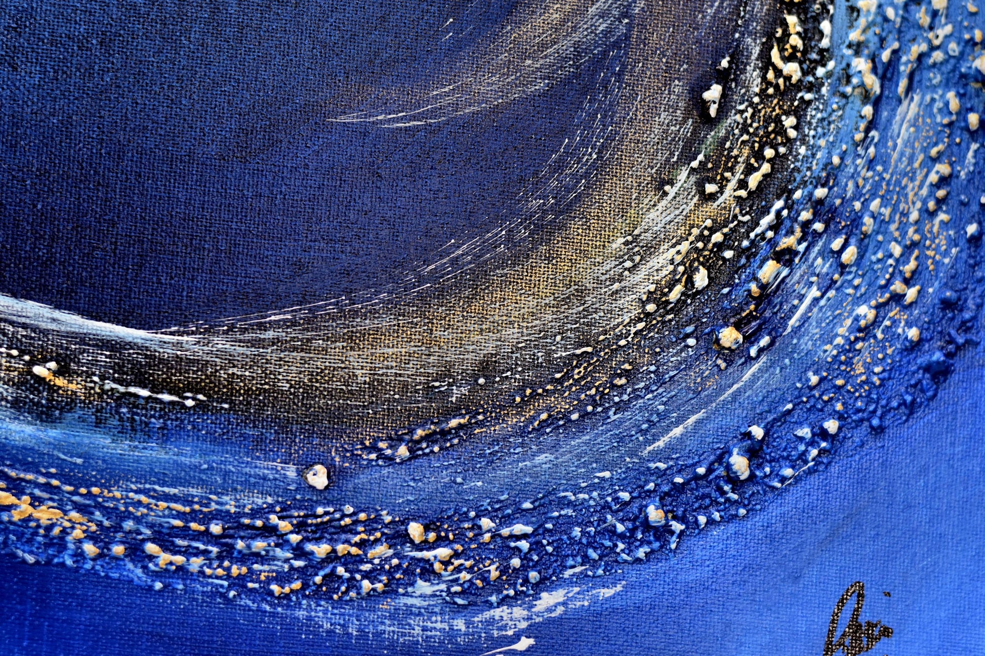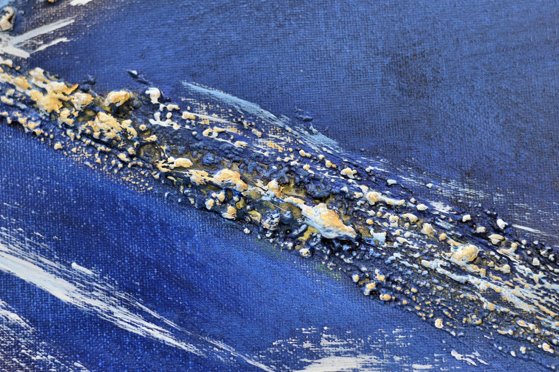 Blue Infinity is a striking abstract composition built around the timeless symbol of the infinity loop. Sweeping strokes of deep blue, textured white, and shimmering golden accents form a dynamic and elegant figure-eight shape, floating on a vibrant ocean-blue background.