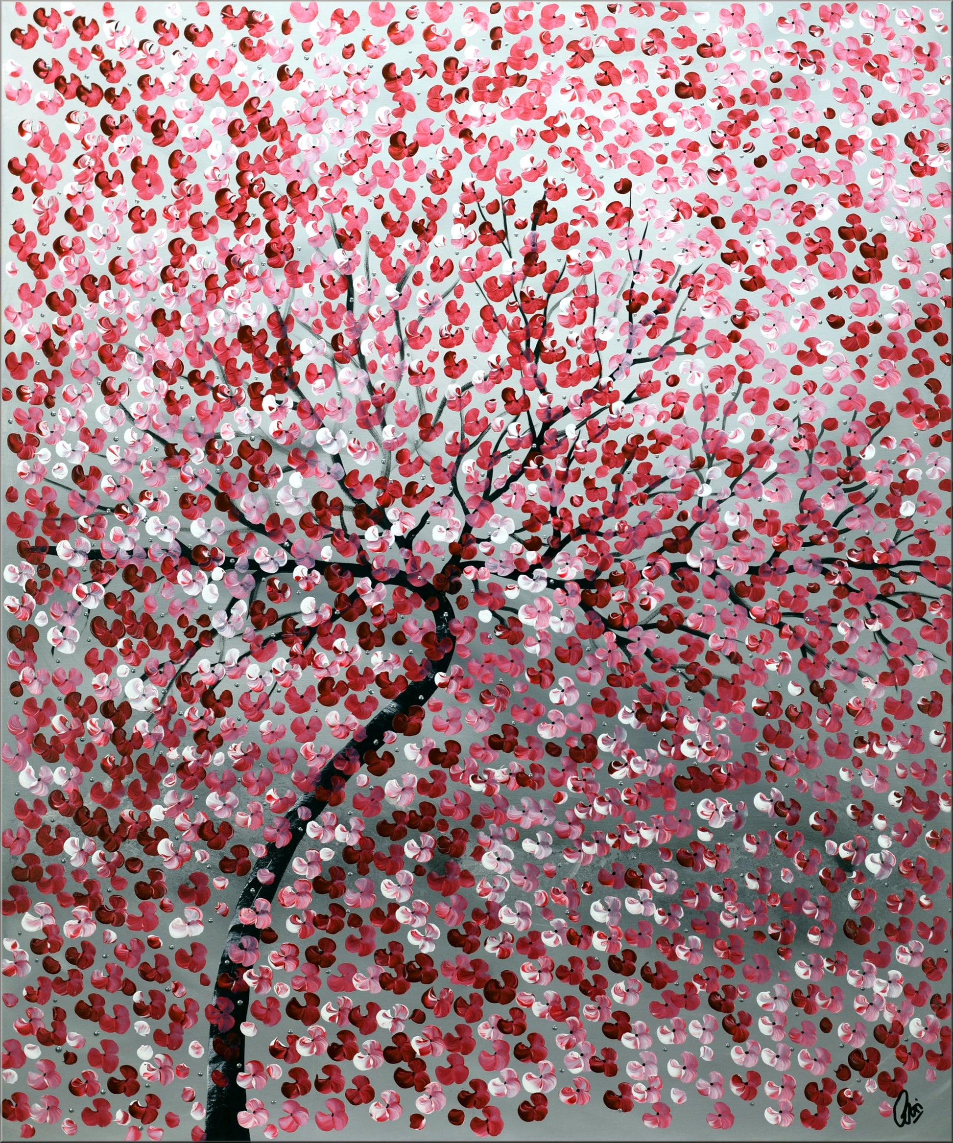 This original acrylic painting by Edelgard Schroer captures the delicate beauty of a cherry tree in full bloom. Thousands of hand-painted blossoms in shades of red, pink, and white, each unique in form, are gently scattered across a soft grey background with subtle silver accents. The composition conveys the warmth and renewal of spring, evoking joy and serenity with every glance.