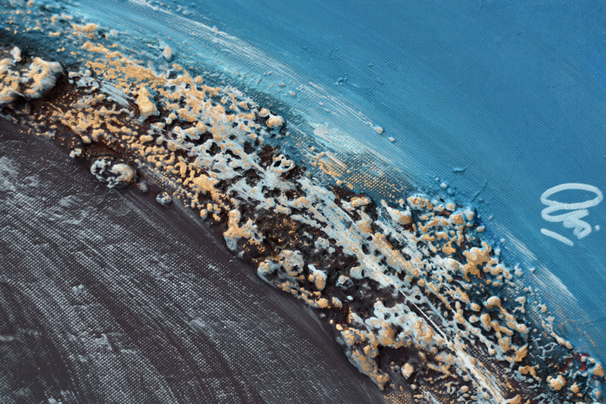 This original abstract acrylic painting by Edelgard Schroer captures the flowing energy of a horizon in motion, where golden textures merge with deep blue tones. Expressive brushstrokes and rich textures create a sense of rhythm and vitality, evoking the endless movement of water and light.