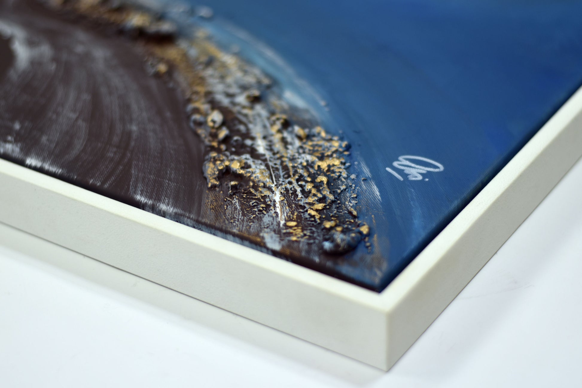 The artwork’s dynamic design and shimmering details make it a striking focal point for modern interiors. Painted on canvas and elegantly presented in a white floater frame, it arrives ready to hang and signed on the front by the artist.