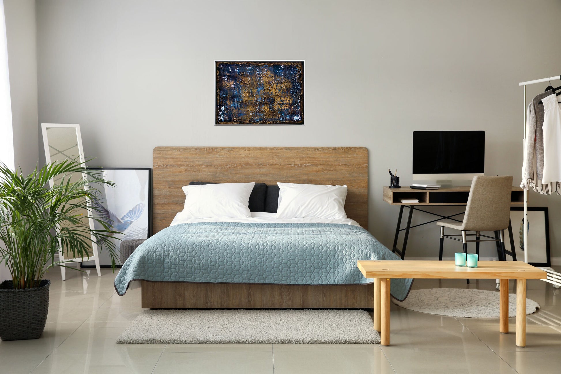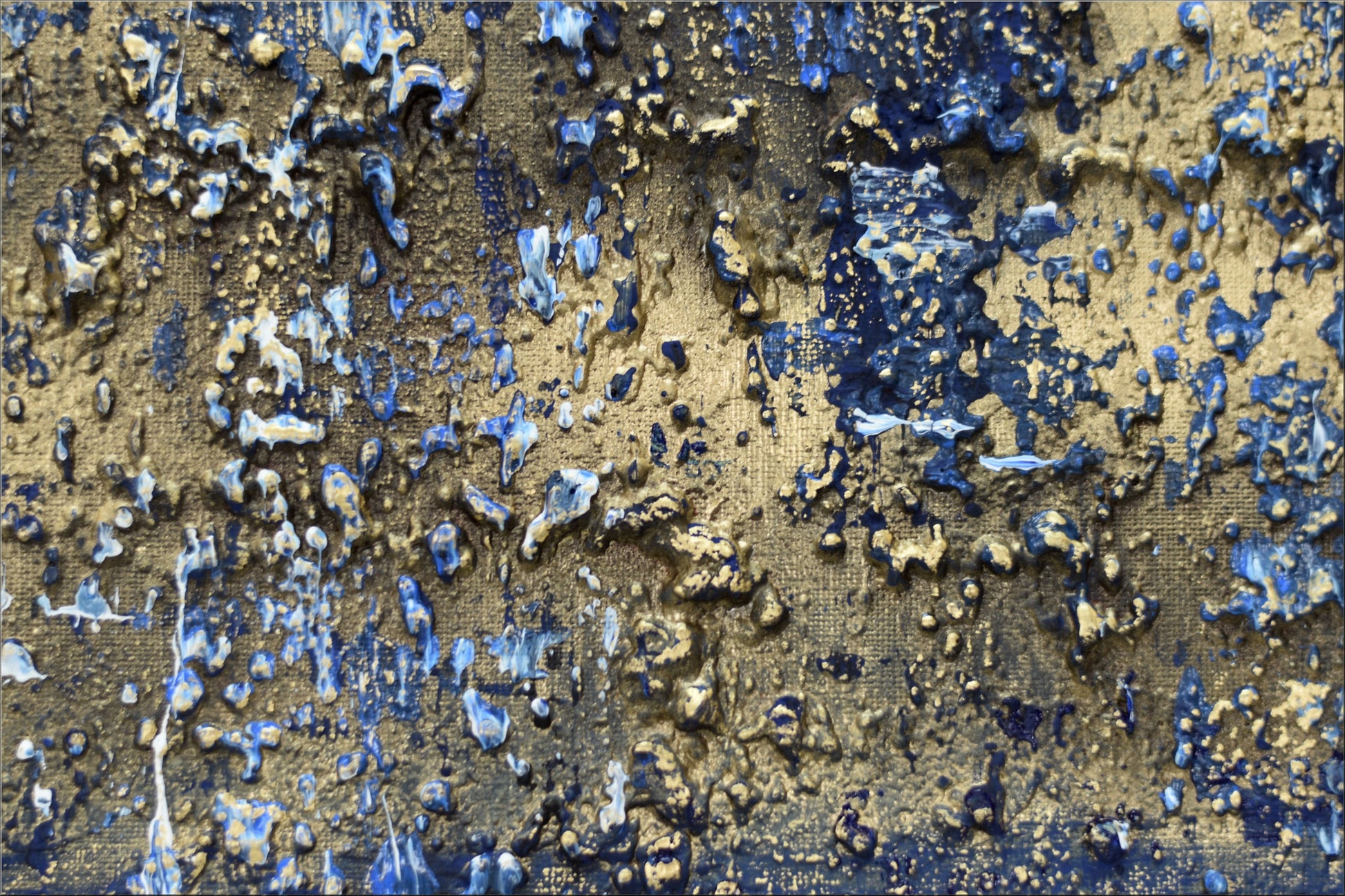 This powerful abstract acrylic painting by Edelgard Schroer features a captivating blend of deep textures and rich metallic tones. Layers of dark blue, black, and luminous gold merge into a dense, expressive composition that radiates both intensity and depth. The heavily structured surface invites touch, while light reflections shift with every change in perspective.