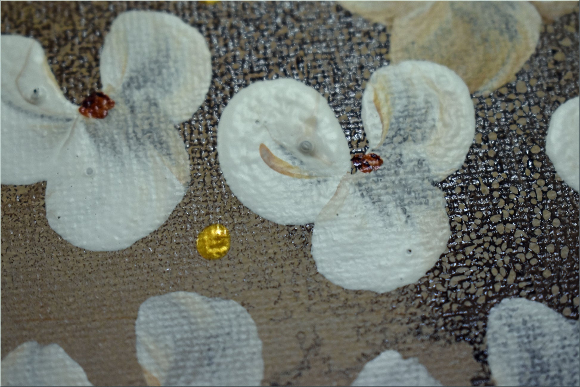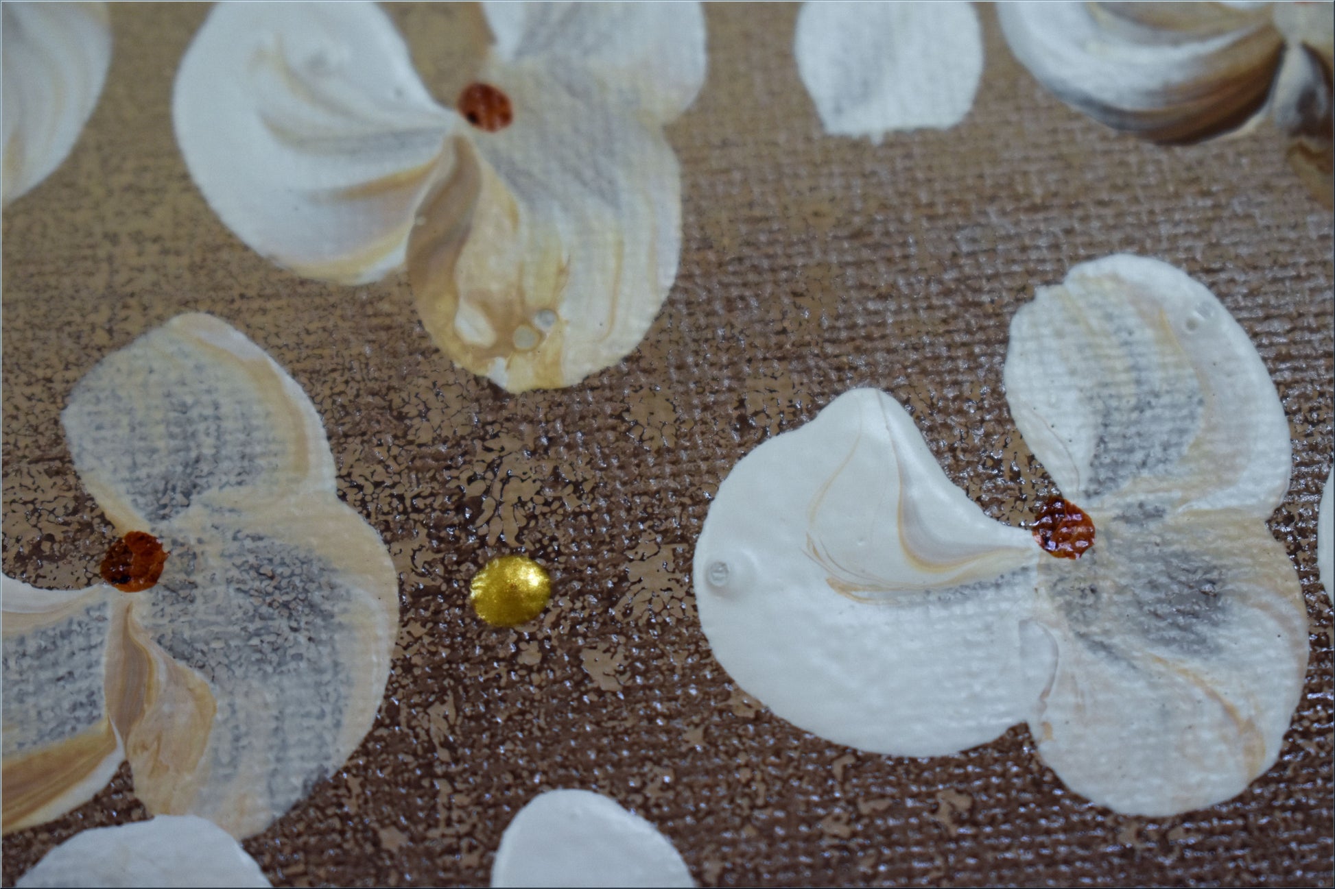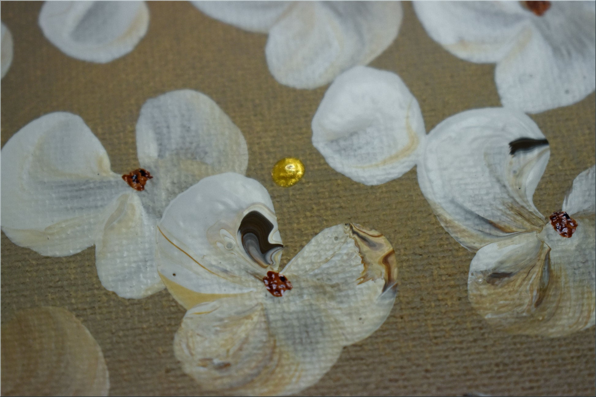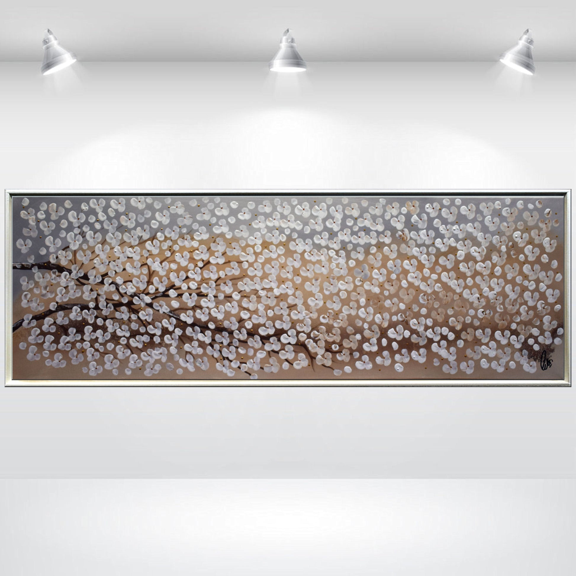 This original abstract tree branch acrylic painting by Edelgard Schroer captures the elegance of nature in a harmonious and timeless style. Shades of grey, brown, white, and subtle golden accents create a soothing atmosphere, while each hand-painted blossom adds vitality and grace.