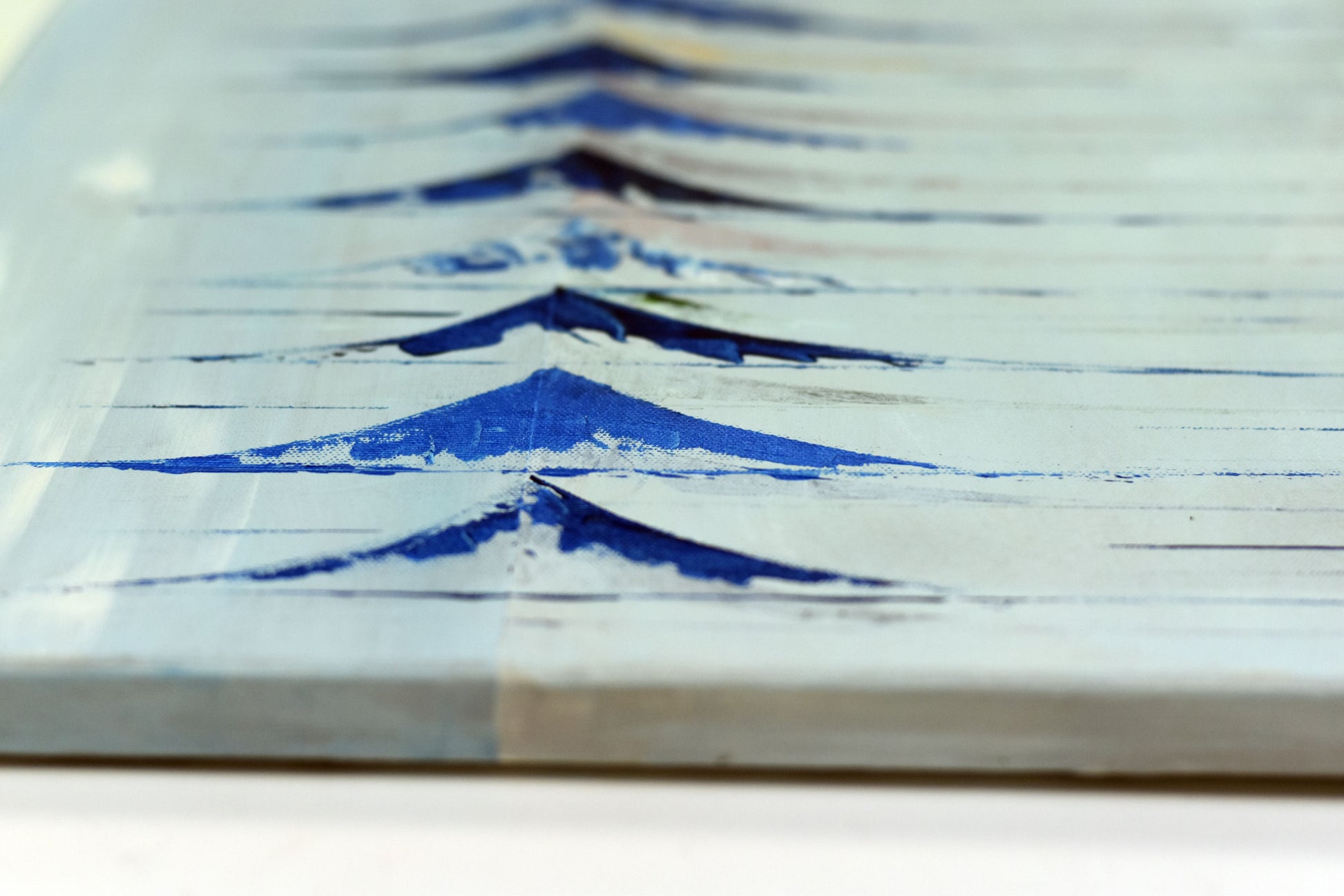 This original acrylic painting by Edelgard Schroer captures the harmony of sails moving in unison across a calm horizon. Abstract blue sailboats are arranged in a rhythmic pattern, evoking both motion and tranquility. Gentle tones of light blue with subtle hints of pink and soft reflections create a serene maritime atmosphere.