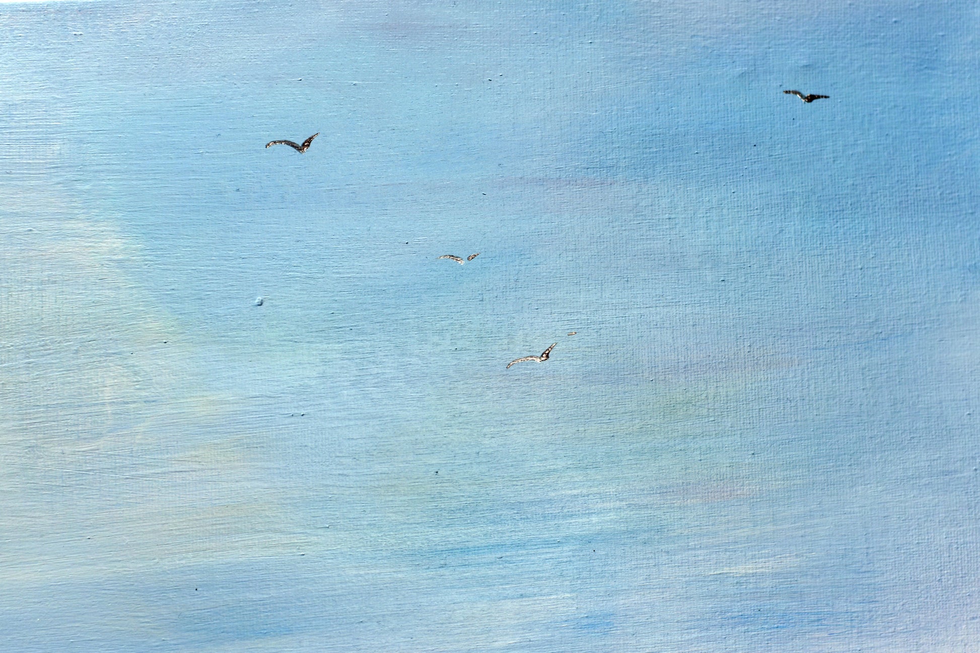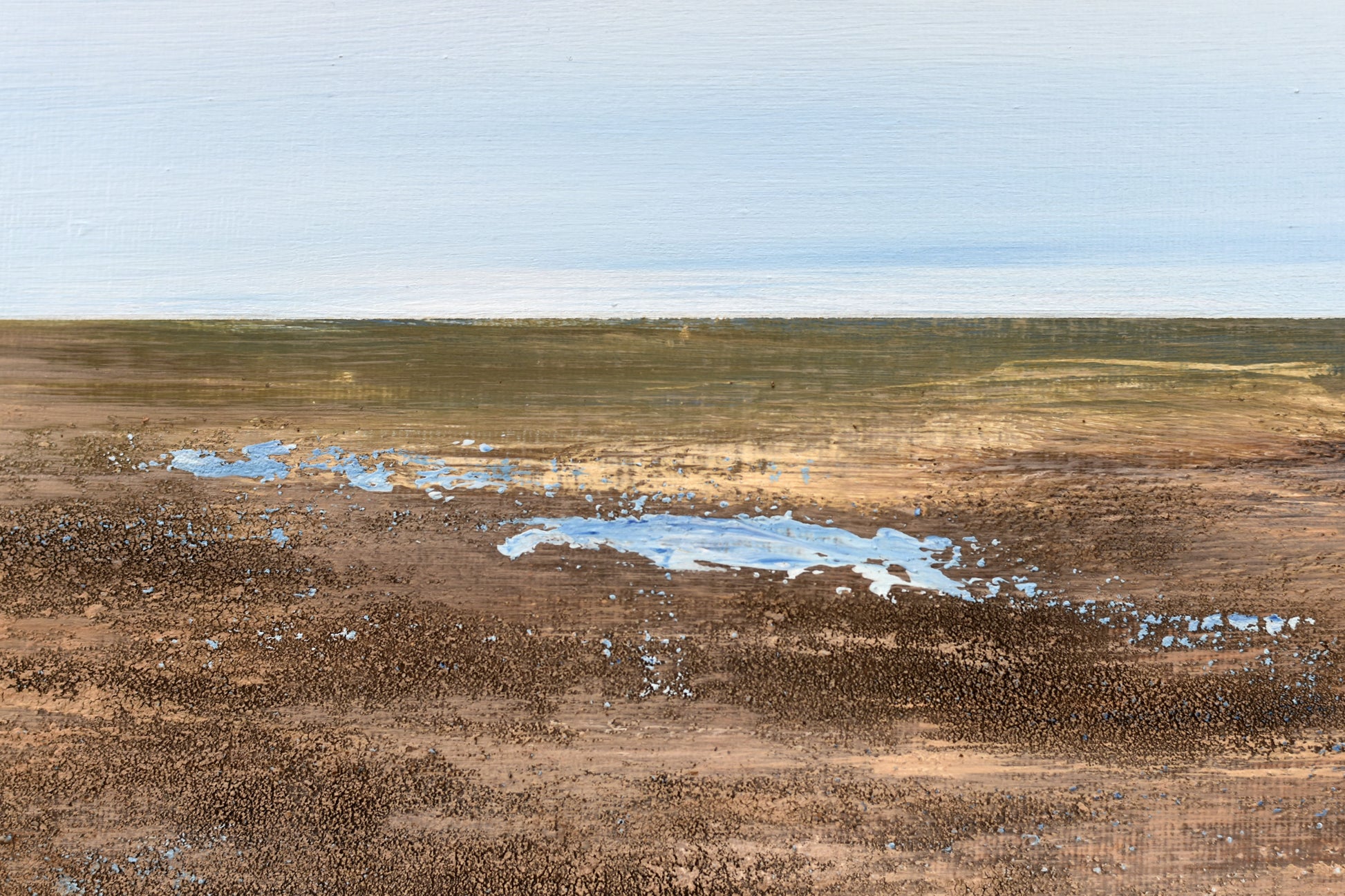 This original abstract coastal acrylic painting by Edelgard Schroer captures the serene beauty of a shoreline. Against a soft blue sky, three graceful sailboats glide along the coast, evoking calmness and freedom. Sandy textures merge with delicate blue highlights, balancing land, sea, and sky.
